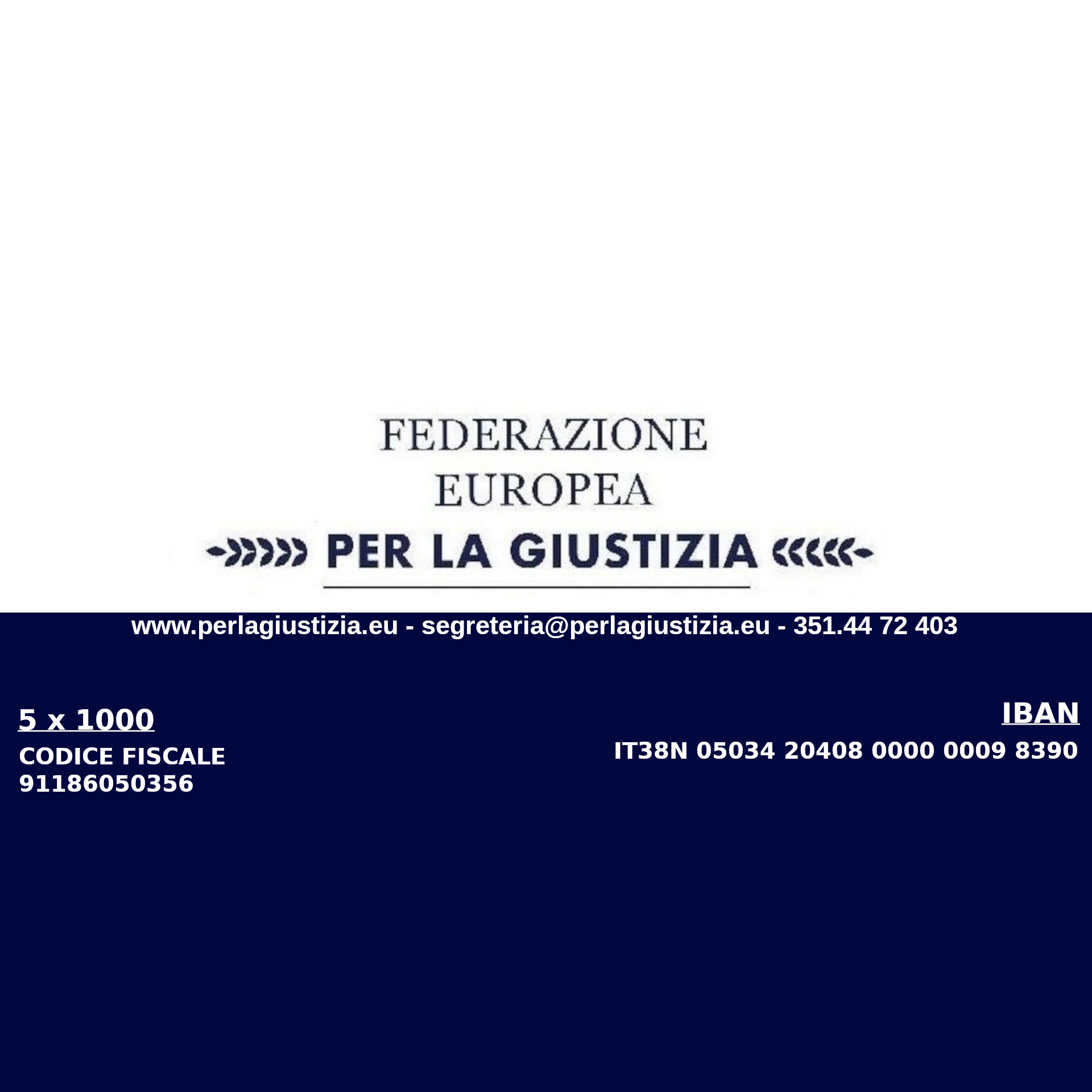 Se sei un’associazione, scarica il seguento modulo, compilalo e invialo via email, unitamente al pdf della disposizione del bonifico della quota associativa, a: segreteria@perlagiustizia.eu.